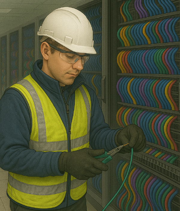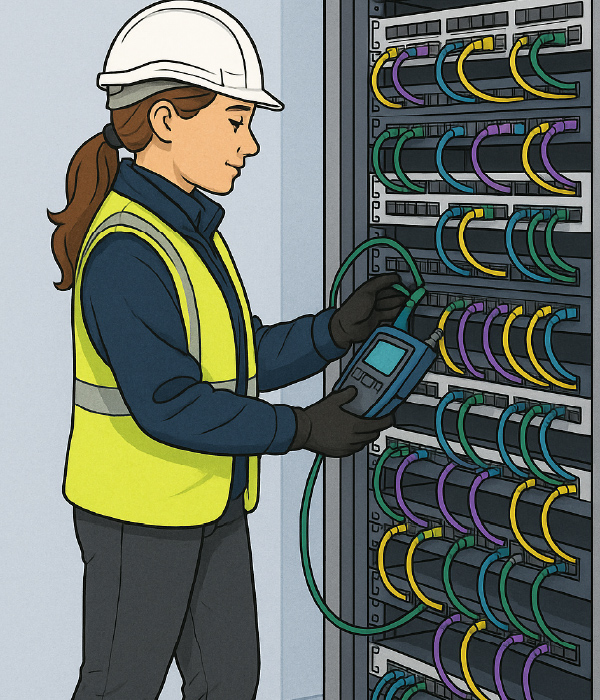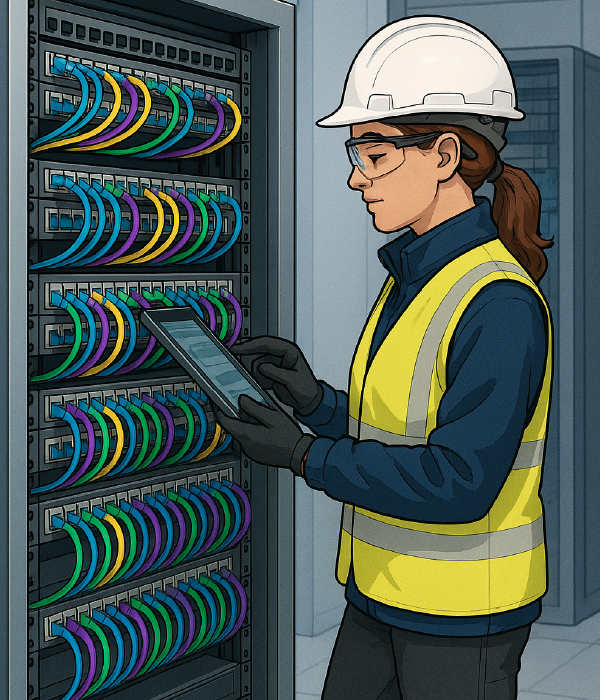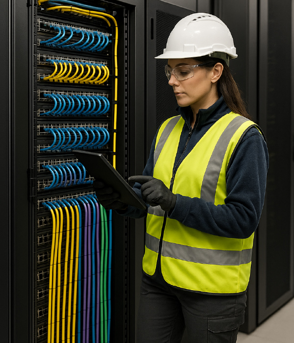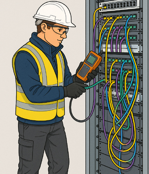 - Extra visual details like checklist, neat cables, tools such as fibre strippers, testers
